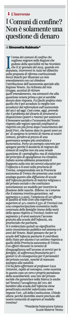 Rassegna stampa del 04.04.2026 – Corriere del Veneto 4 Febbraio 2026 I Comuni di confine? Non รจ solamente una questione di denaro L’intervento di Simonetta Rubinato, Presidente FISM Treviso