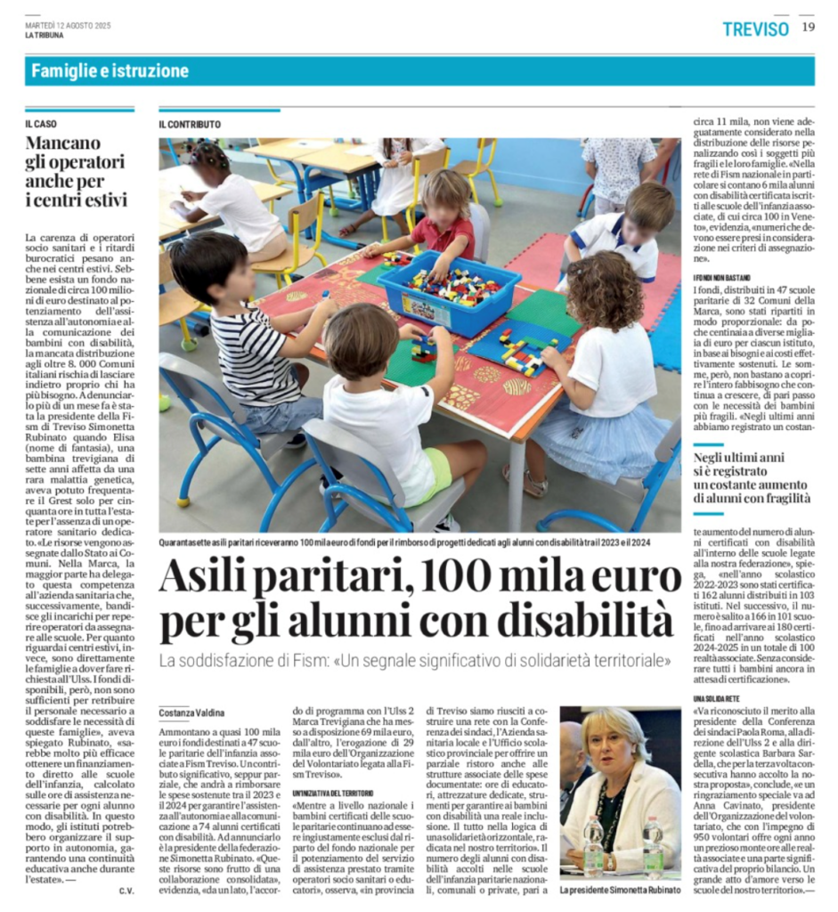 Rassegna stampa del 12.08.2025 – La Tribuna Agosto 12, 2025 News, Rassegna stampa Asili paritari, 100mila euro per gli alunni con disabilità PrecedenteSono 100 mila gli euro in arrivo per attività con alunni disabili SuccessivoRassegna stampa del 13.08.2025 – Il Gazzettino Rassegna stampa del 02.10.2025 – La Vita del Popolo 2 Ottobre 2025 Identità e nuove sfide Rassegna stampa del 02.10.2025 – L’Azione 2 Ottobre 2025 A Santa Lucia di Piave il convegno Fism delle scuole dell’infanzia paritarie su culture e religioni Rassegna stampa del 29.09.2025 – Treviso Today 29 Settembre 2025 Treviso, laboratorio artigianale di dialogo tra religioni diverse Riunite a Santa Lucia di Piave oltre 900 insegnanti degli asili paritari della Fism trevigiana Nonostante nelle